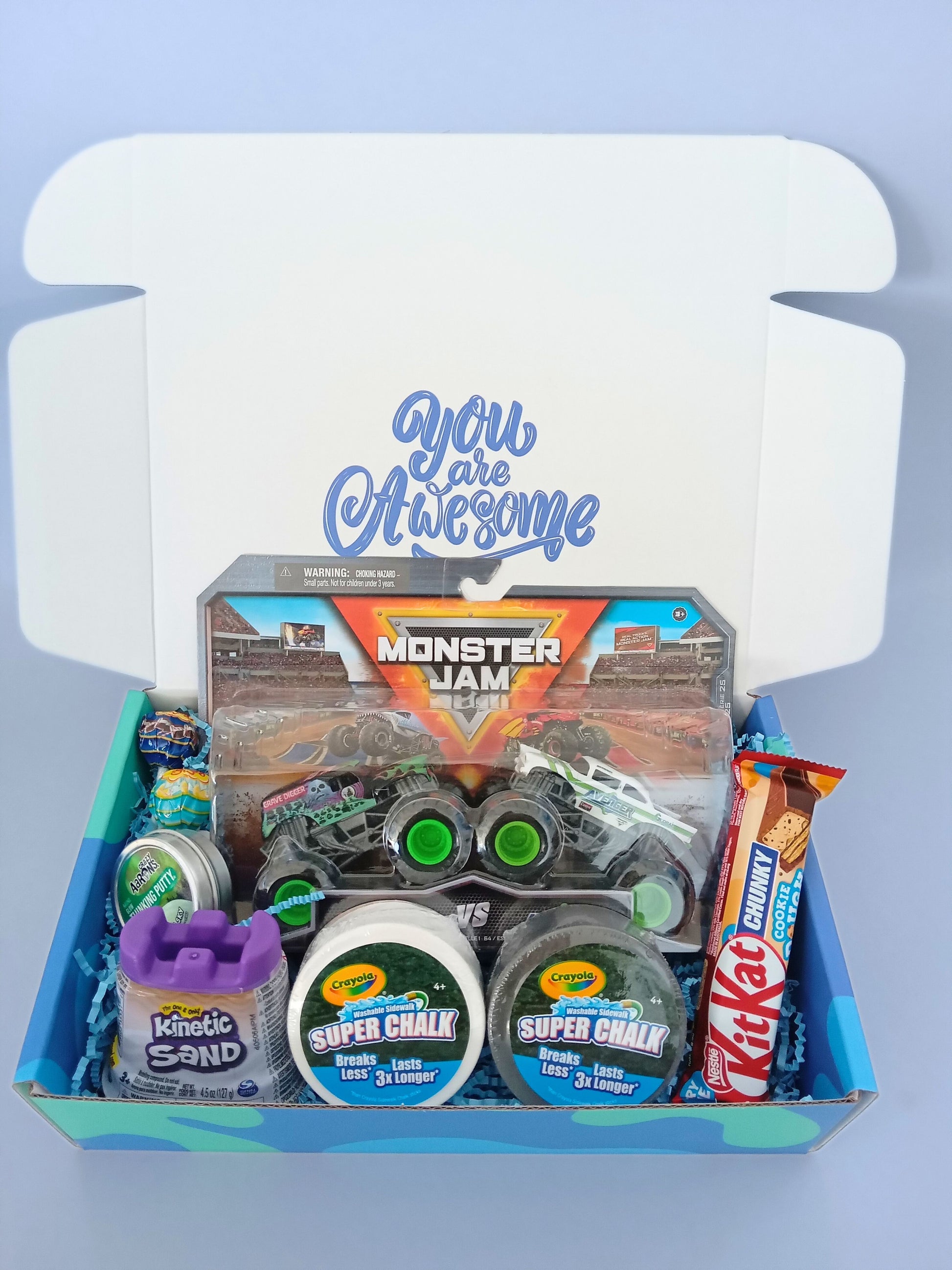 Get ready for an Epic Monster Jam adventure packed with endless fun! Dive into the excitement with Crazy Aaron’s Thinking Putty that stretches and bounces in your hands. Feel the magic of Kinetic Sand as you mold and shape your own monster tracks. Grab the colorful sidewalk chalk to create wild designs and raceways outside. And when you need a break, enjoy some delicious sweet treats to fuel your adventures. This box is the perfect mix of creativity, play, and tasty surprises that will keep kids entertained for hours!