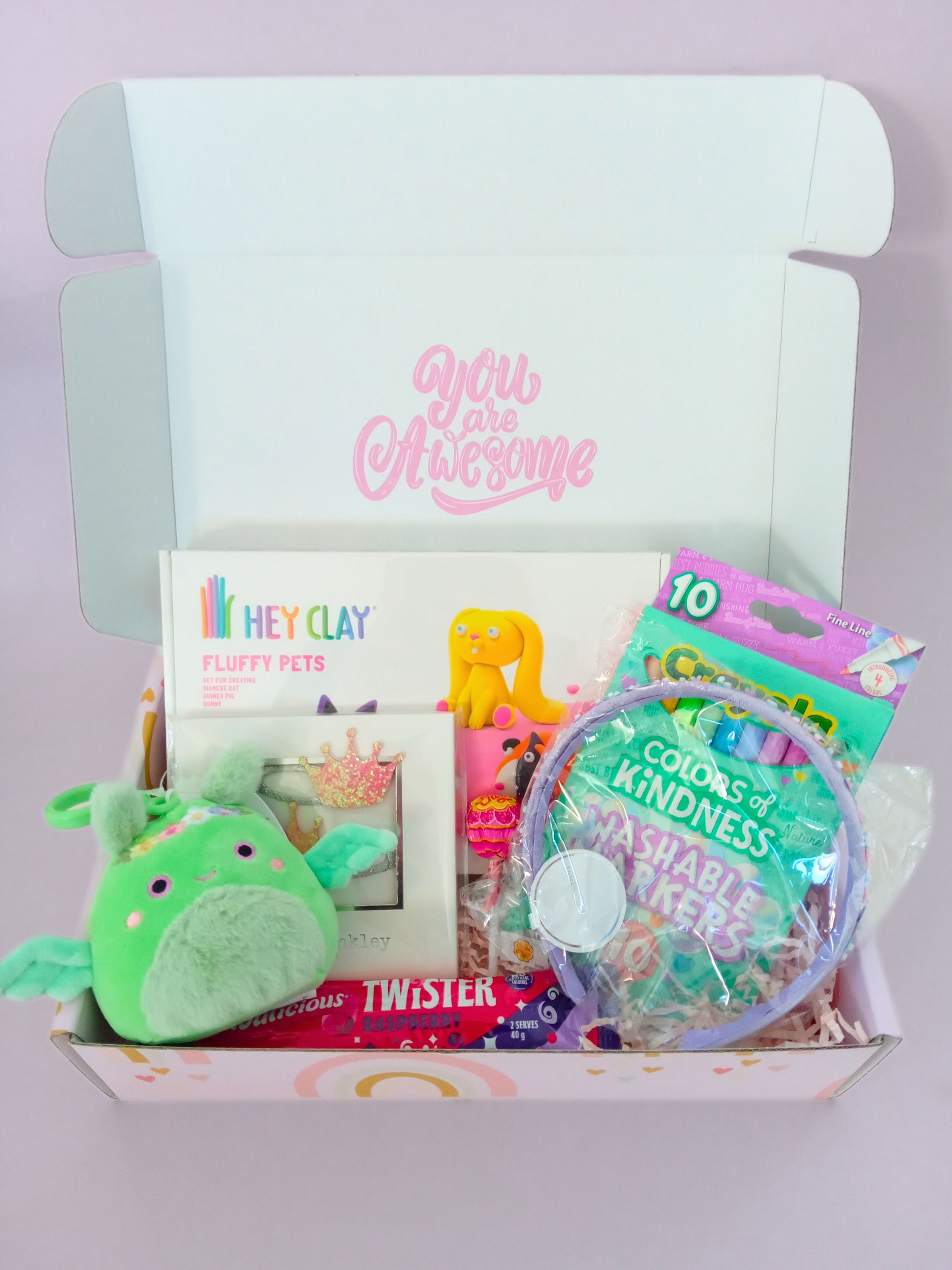 The Playtime Surprise gift box is packed with delightful goodies to brighten any little one’s day! Inside, they’ll find the Hey Clay Fluffy Pets activity set, perfect for sparking creativity and hands-on fun. A Squishmallow clip adds a touch of cuddly fun, while the Crayola Colours of Kindness set encourages imaginative coloring adventures. The box includes Lauren Hinkley hair clips and a matching headband for some styling play. And of course, no celebration is complete without some tasty sweet treats to enjoy. This box is a joyful bundle of play, creativity, and smiles!